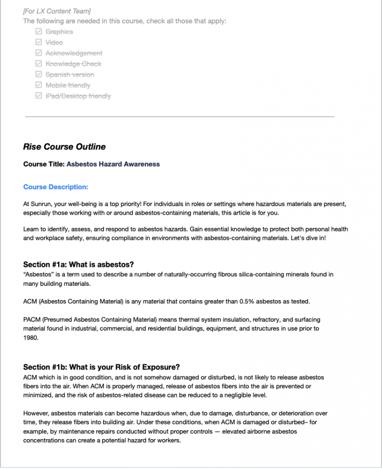 Content drafts, Course Outlines, Script Development, and Behavior Mapping
