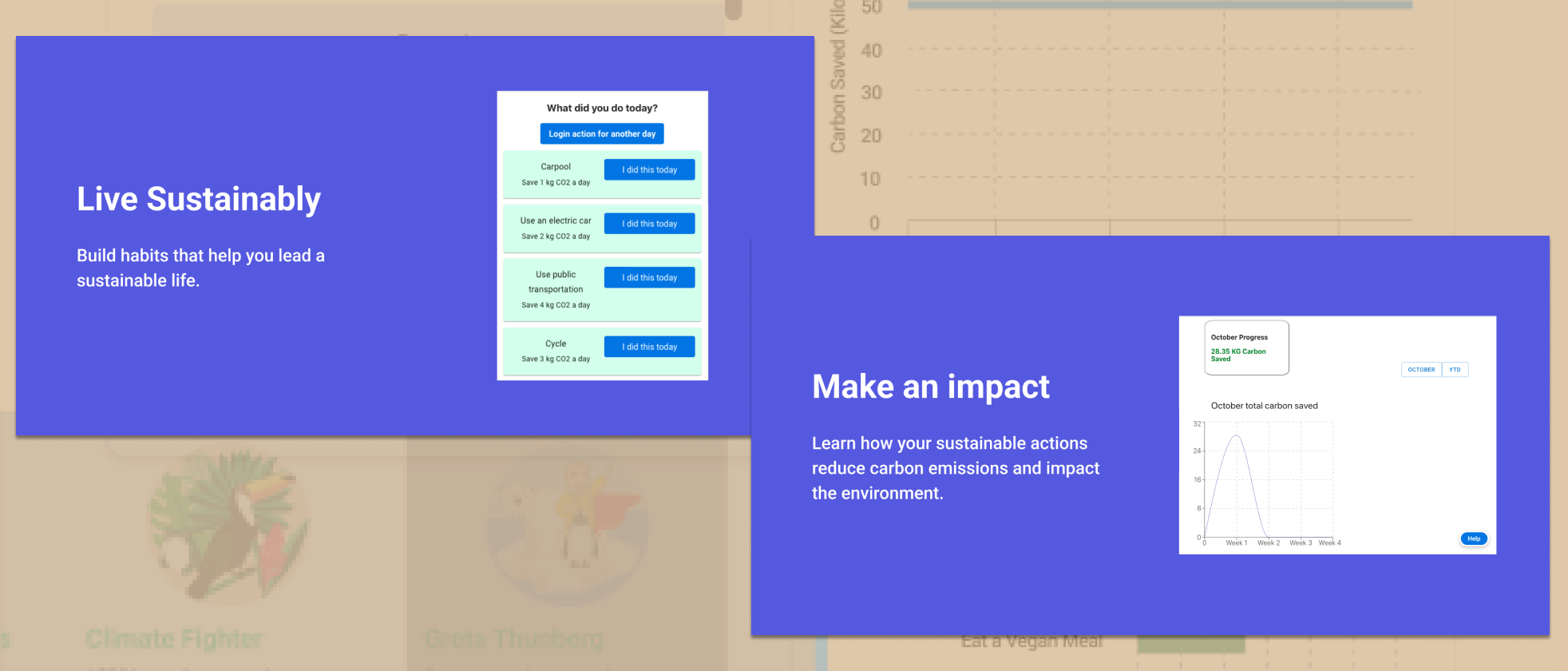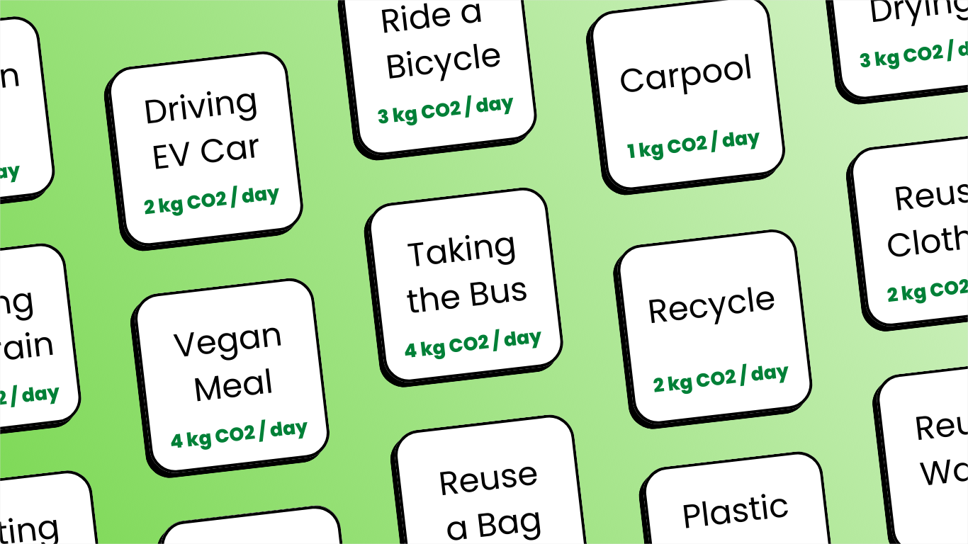 Create a gamified C02 tracker where the user selects the tasks for the day while the app tracks how much C02 that task saved and compare results with other team members to earn badges.