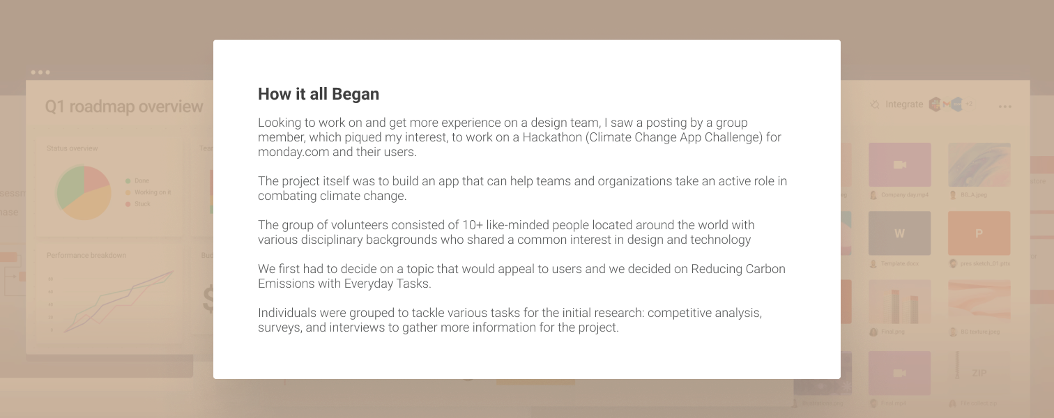 Looking to work on and get more experience on a design team, I saw a posting by a group member, which piqued my interest, to work on a Hackathon (Climate Change App Challenge) for monday.com and their users.