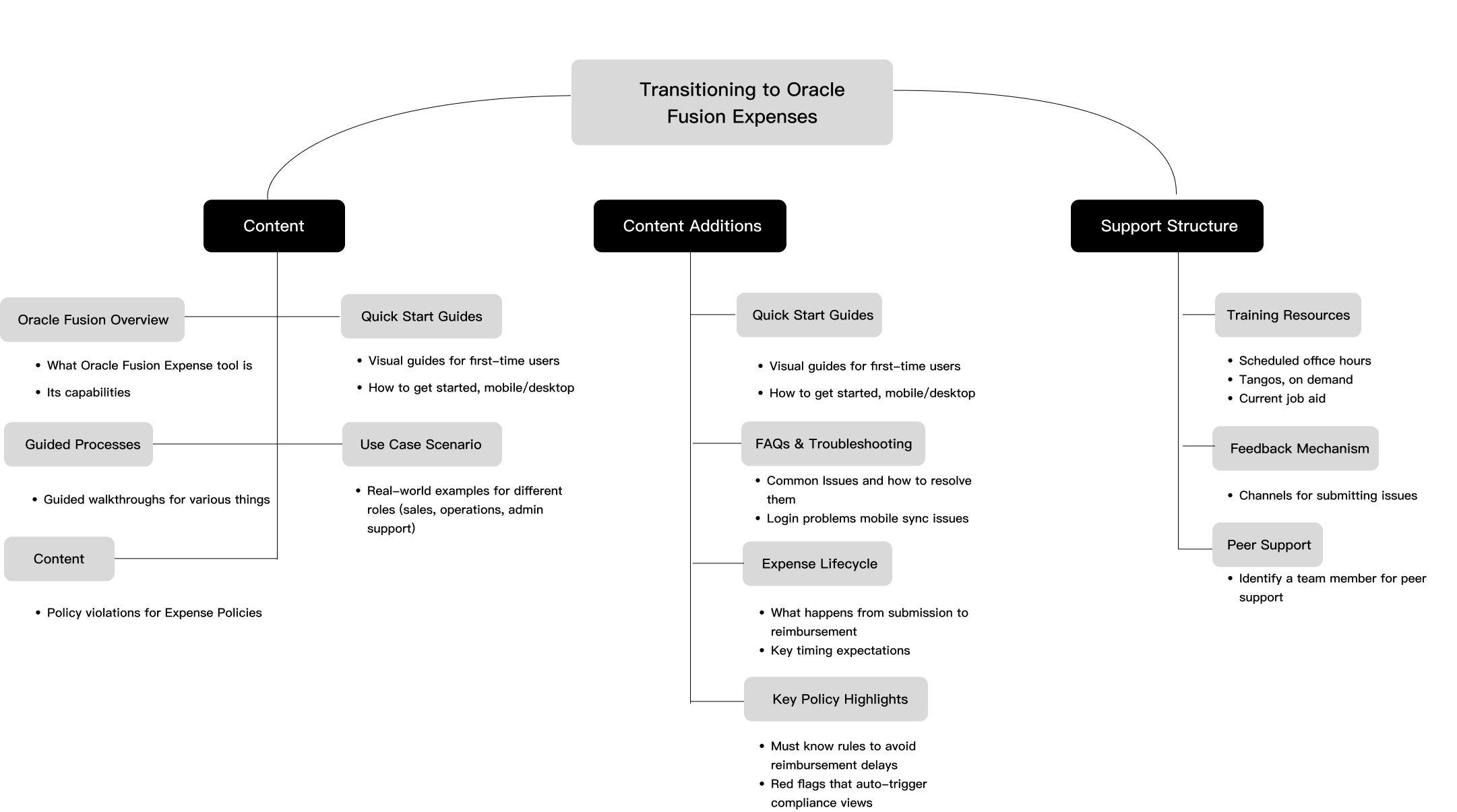 With insights from the discovery phase, I mapped out a just-in-time training plan that aligned learning objectives to real-world tasks—like submitting an expense or tracking reimbursements.